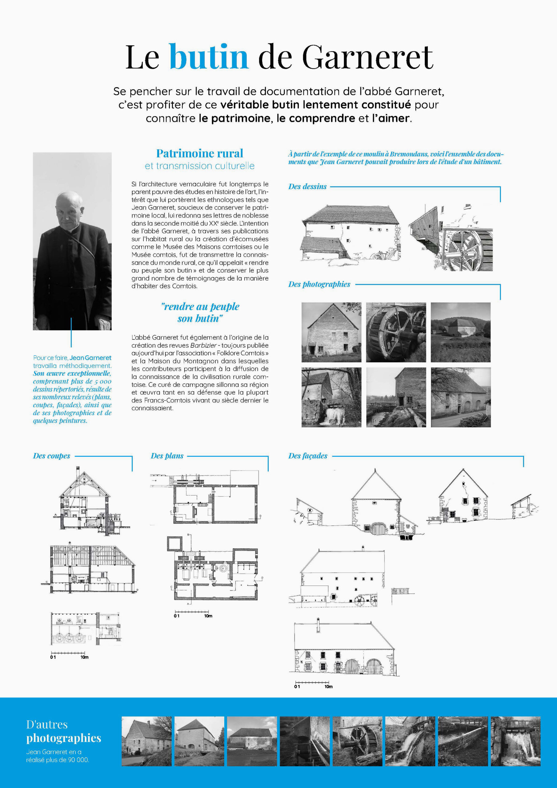 L’exposition consacrée à Jean Garneret, initiée il y a quelques années par une stagiaire du CAUE du Doubs, met en lumière le regard sensible et engagé de cet artiste et ethnologue profondément attaché à la Franche-Comté. À travers un ensemble de reproductions, de textes et de documents, elle valorise son travail de mémoire autour des paysages, des traditions rurales et du patrimoine régional.