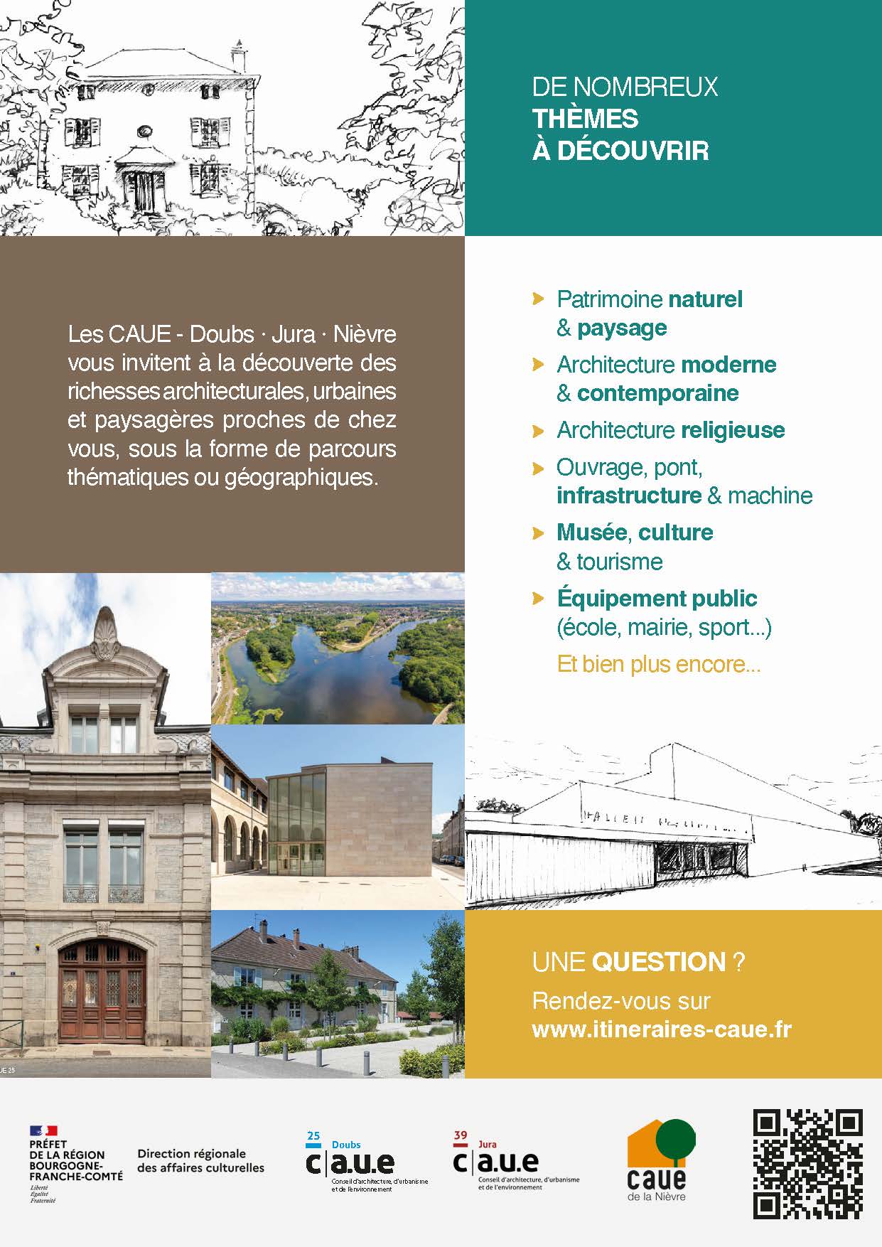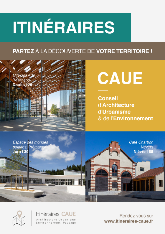 Projet conçu pour les CAUE du Doubs, du Jura et de la Nièvre, valorisant les richesses architecturales, urbaines et paysagères à travers des itinéraires thématiques et géographiques.